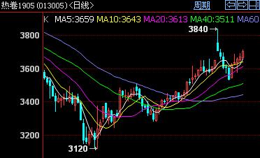 2月22日,热卷板期货继续反弹。HC1905开盘3666元/吨,收盘3706元/吨,盘中高点3713元/吨,低点3706元/吨。成交量大幅下降,为537082手,持仓量再度减少,为574168手。 【技术面】 技术面,主力合约五连阳,日内震荡上行,短线反弹延续。节后各地陆续开工,终端需求好转,推动价格持续上调。目前行情正处于3600-3800调整区间内,盘面形态偏多,但面临调整压力。短期走势继续谨慎看涨,关注上方3800压力。 【操作指南】 短线方面,波段操作;中长线方面,趋势多单谨慎持有。(仅供参考) 【相关市场概况】 | 市场分类 | 品种合约 | 涨跌幅 | 收盘价 | 开盘价 | 最高点 | 最低点 | 成交量 | 持仓量 | | 期货 | 铁矿石1905 | ↑0.5 | 618.5 | 610 | 619 | 598.5 | 2445022手 | 1054816手 | | 焦煤1905 | ↑9.5 | 1295 | 1289 | 1299.5 | 1276.5 | 226230手 | 259888手 | | 焦炭1905 | ↑34.5 | 2163 | 2128 | 2165.5 | 2122 | 387502手 | 344200手 | 【现货面】 今日现货市场继续上调。主导市场看,上海地区平稳,厚规格报价3770 元/吨;天津地区 平稳,报价3700 元/吨;广州市场 涨10 元/吨,报价3850 元/吨。( 详细) 期货震荡上行,现货成交好转,部分地区报价持续上调。(SWQX组稿 请勿转载) (此信息仅供客户作为参考,并不构成对客户的直接决策建议,客户不应以此取代自己的独立判断,客户做出的任何决策与商务前线无关) 商务前线公众号(微信号:www_swqx_com)中国最全面的钢铁信息平台,每天为你传递国内外最新鲜的钢铁资讯!!!扫描首页二维码关注!!!