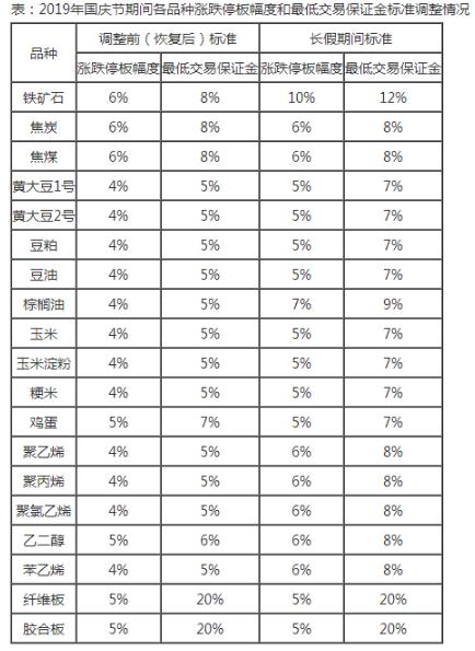 自2019年9月27日(星期五)结算时起,将铁矿石品种涨跌停板幅度和最低交易保证金标准分别调整至10%和12%;将棕榈油品种涨跌停板幅度和最低交易保证金标准分别调整为7%和9%;将聚乙烯、聚丙烯、聚氯乙烯、乙二醇和苯乙烯品种涨跌停板幅度和最低交易保证金标准分别调整为6%和8%;将黄大豆1号、黄大豆2号、豆粕、豆油、玉米、玉米淀粉和粳米品种涨跌停板幅度和最低交易保证金标准分别调整为5%和7%;将焦炭、焦煤、鸡蛋、纤维板和胶合板品种涨跌停板幅度和最低交易保证金标准维持不变。