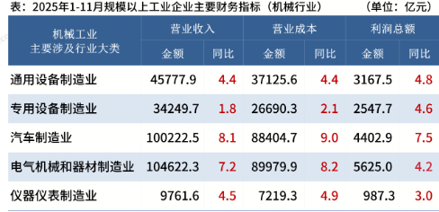 12月27日,国家统计局最新数据显示,2025年1-11月,全国规模以上工业企业实现利润总额66268.6亿元,同比增长0.1%。 机械工业主要涉及行业大类利润总额5增。其中,通用设备制造业增长4.8%,专用设备制造业增长4.6%,汽车制造业增长7.5%,电气机械和器材制造业增长4.2%,仪器仪表制造业增长3%。